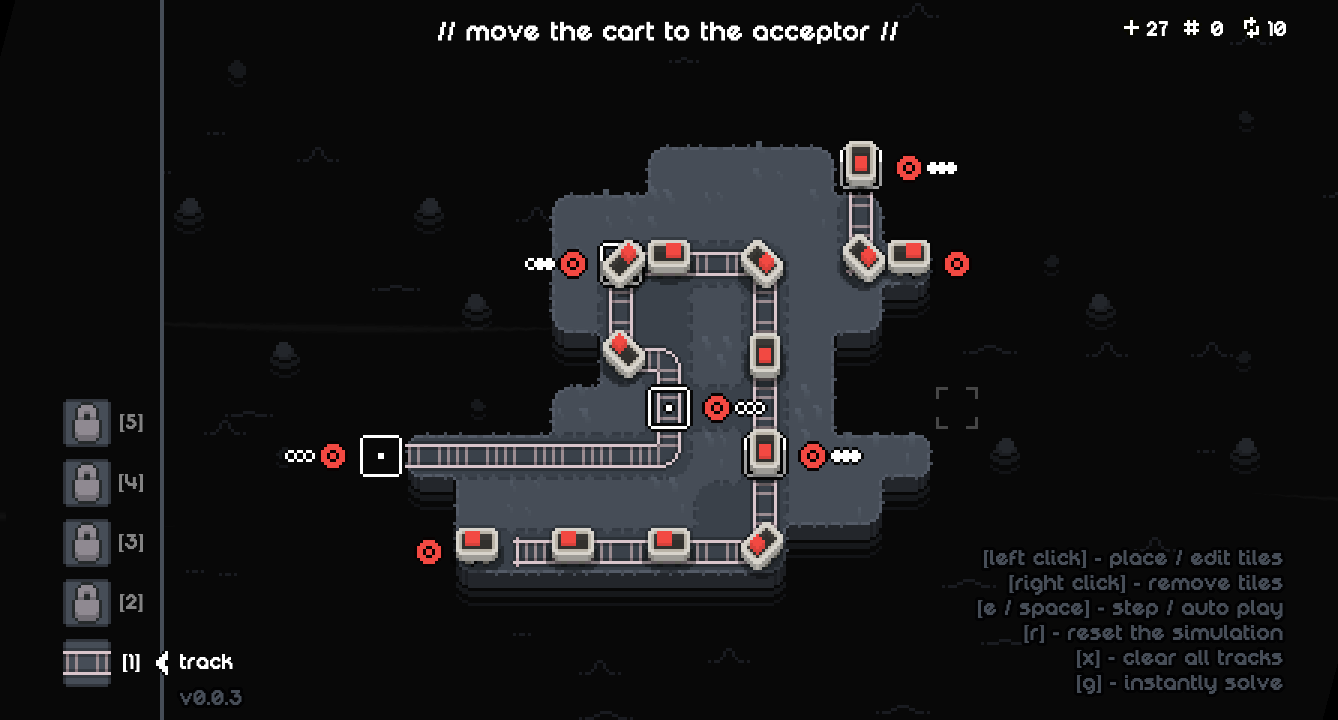 - Removed errors/mistakes/failing levels entirely - carts will now crash if smashed together, and acceptors still expect correct un-crashed outputs, but now failing either of these won't cause you to pause or fail, allowing for some (interesting) solutions, and hopefully improving the QoL of play!